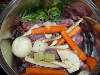A szükséges mennyiségű húst, jelen esetben liba nyaka (amit sokan nem szeretnek, de mi igen) és zöldségeket alaposan megtisztítottam, és egy hatalmas edénybe tettem. Zöldségek: répa, petrezselyem, karalábé, zeller, egy nagy fej hagyma, két gerezd fokhagyma, és egy nagy adag petrezselyemzöldet összekötöztem egy nagy adag zeller zölddel, fűszerként: egész borsot és két tyúkhúsleveskockát tettem az edénybe: